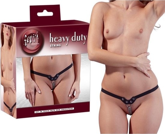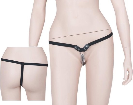 De string heeft in plaats van een kruisje twee metalen kettingen die bewegen bij elke stap die je neemt. Je voelt hoe het koude metaal tegen elke plekje van jouw warme vlees aan beweegt. De elastische tailleband is gemaakt van zwart kunstleder.