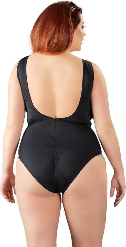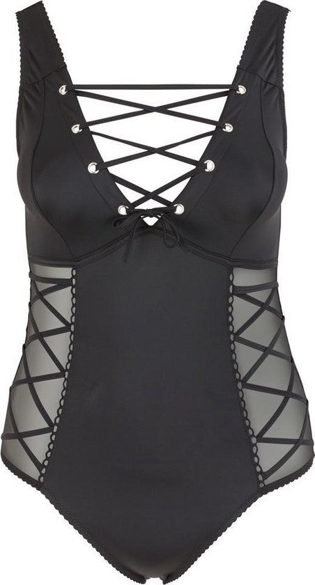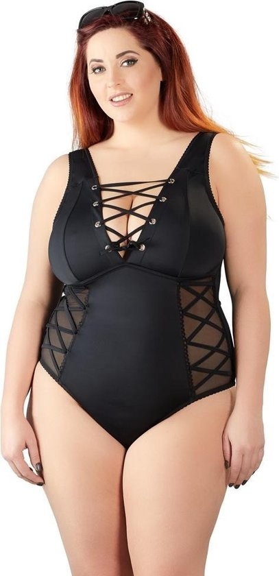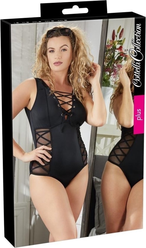 Het lichaam onderscheidt zich van de rest vanwege de laag uitgesneden splitsing met oogjes en veters en transparante inserts weerszijden sierveter overdreven. Het is ook laag uitgesneden aan de achterkant ook en er is een ruches naad over de billen.