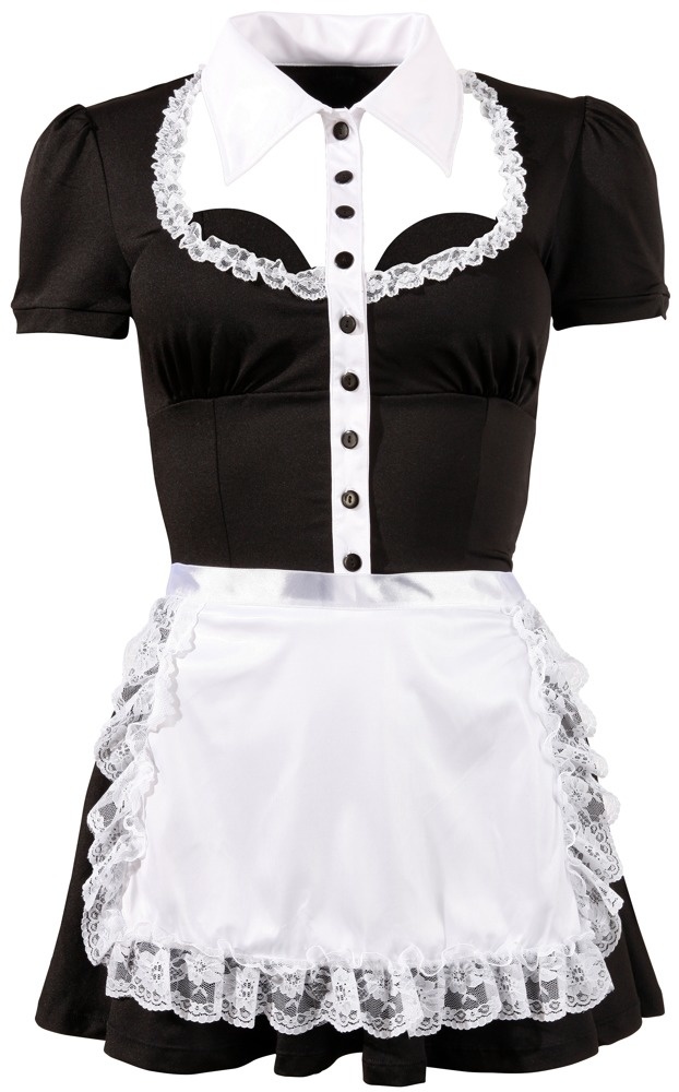 Zwarte mini-jurk met witte kraag, met knoopjeslijst met kanten versieringen aan de decolleté. Inclusief witte schort die je aan de achterkant kunt strikken. Mini-jurk: 90% Polyester, 10% Elastaan. Schort: 100% Polyester.