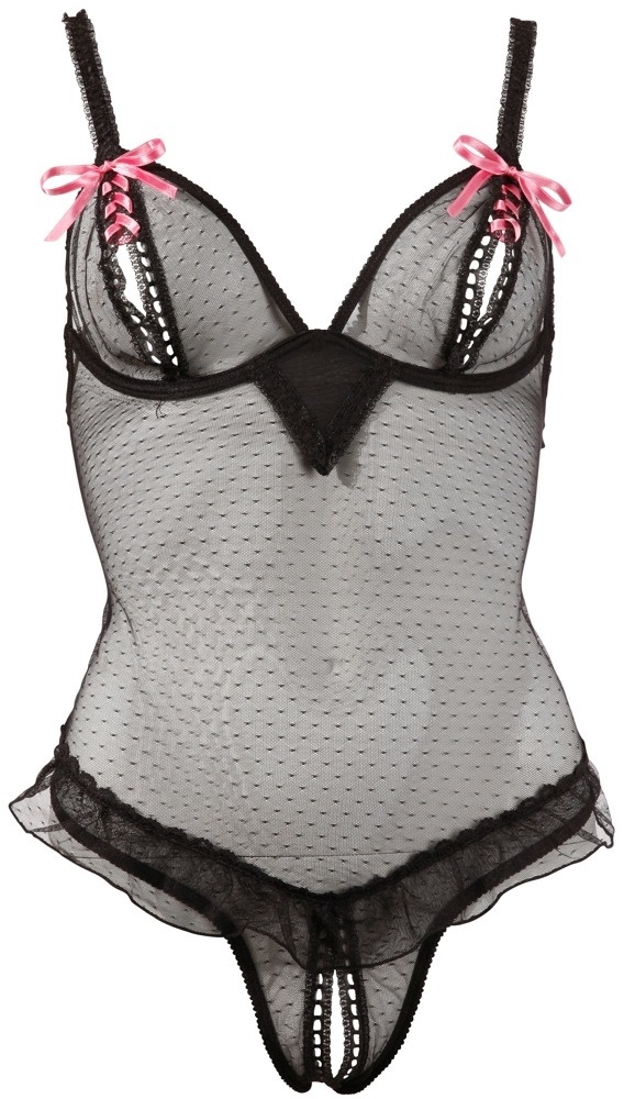 Een echte droom die werkelijkheid wordt. Deze kruisloze body met lichte ruches geeft een karakter af met haar rode strikjes maar niets is minder waar. De cups kun je open maken waardoor jouw tepels zichtbaar naar buiten komen. De transparante netstof geeft jouw fijne huid weer waardoor jouw lichaam een mooi silhouet vormt. Met een echte 50’s look ben je helemaal klaar voor de spannende avonden.