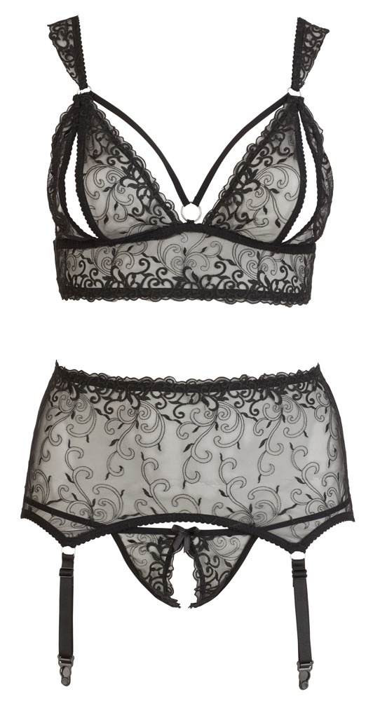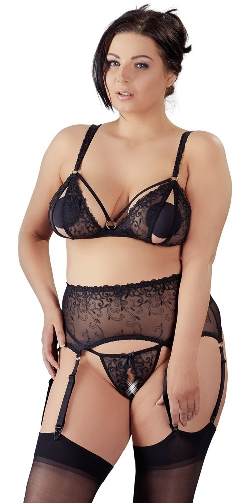 Dit ondeugende jarretel setje heeft alles om jou verleidelijk te maken. De kanten afwerking zorgt voor een transparante weergave van jouw gehele lichaam. De open cups en kruis dragen bij aan jouw stoute uitstraling. Met de complete set ben je onweerstaanbaar voor alles en iedereen.