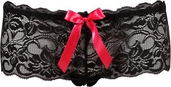 Zwart kanten broekje met opvallende roze strik aan de voorzijde en een open kruisje. Op de achterkant zit ook een klein roze strikje bevestigd. Het broekje sluit nauw aan en geeft een sexy look!