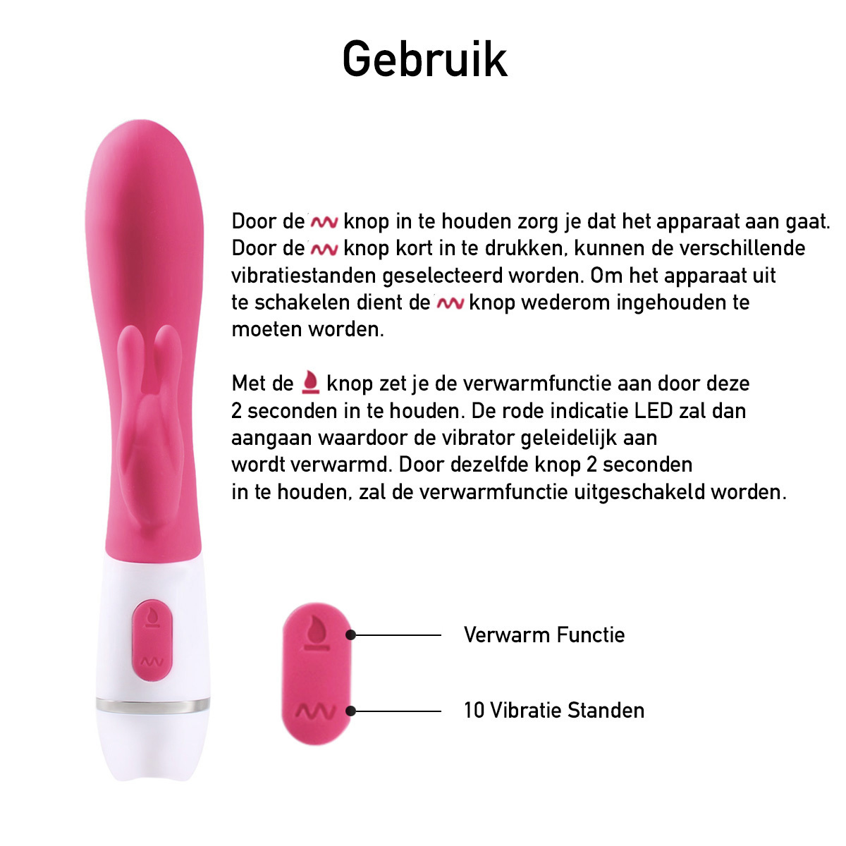 De vibrator heeft naast het verwarmingselement 10 standen die je kunt bedienen via de knoppen onder op de vibrator. Het product is voorzien van een Li-ion batterij welke uren van plezier levert op een volledig opgeladen accu.